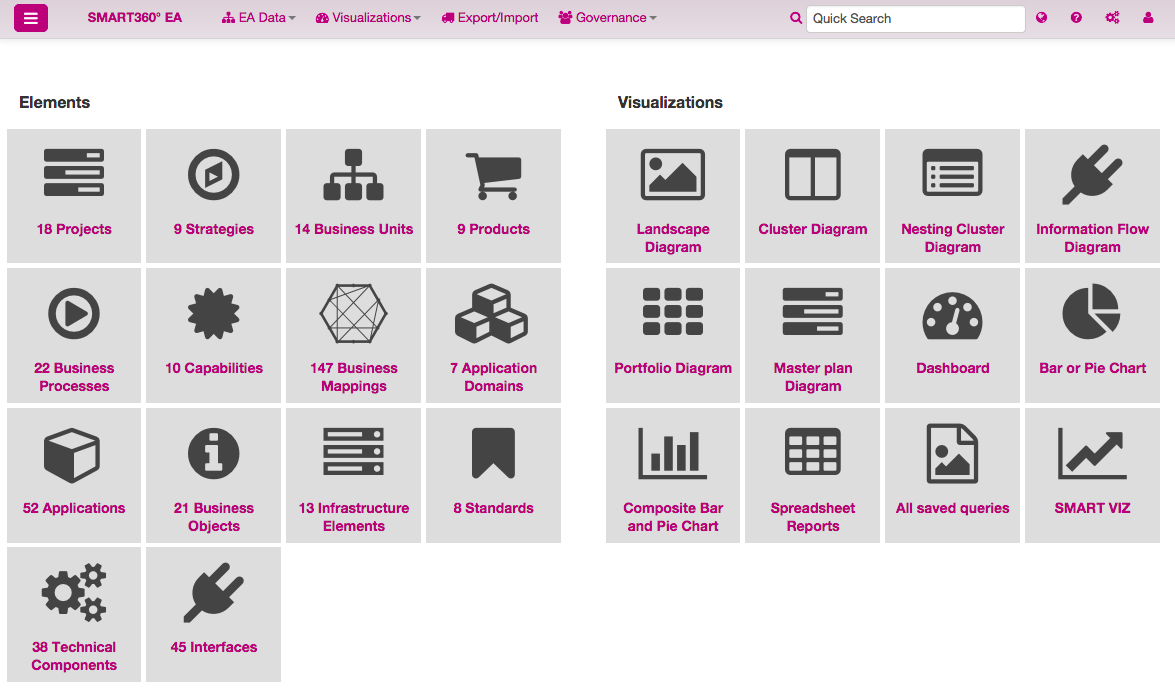 Smart360 ist ein EA-Tool zur Optimierung der IT-Strukturen im Unternehmen. So ermöglichen verschiedene Werkzeuge, eine dynamische Analyse der Unternehmensstruktur, eine darauffolgende Rationalisierung, und damit eine Optimierung verschiedener Strategien und Entscheidungen. Um das Portfoliomanagement voranzutreiben, werden Dienstleistungen wie Beratung, Vor-Ort-Schulungen und Tutorial-Aufzeichnungen angeboten.