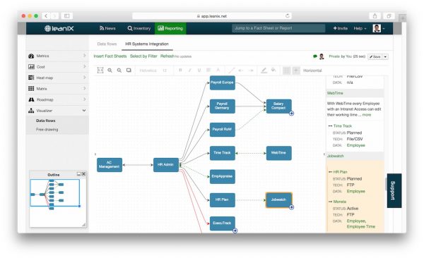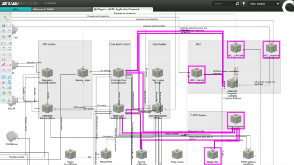 Das SAMU EA Tool bietet viele Möglichkeiten zur Dokumentation vorhandener Architekturen. Informationen werden im Repository gesichert und daraus resultierende Reports per Klick generiert. Beziehungen zwischen einzelnen Systemen und Informationsflüssen können in die Modellierung eingearbeitet werden. Zusätzlich bietet das Tool Funktionen zur Entscheidungsoptimierung und stellt Masken für die Projektaufsetzung sowie Rolloutterminierung bereit.