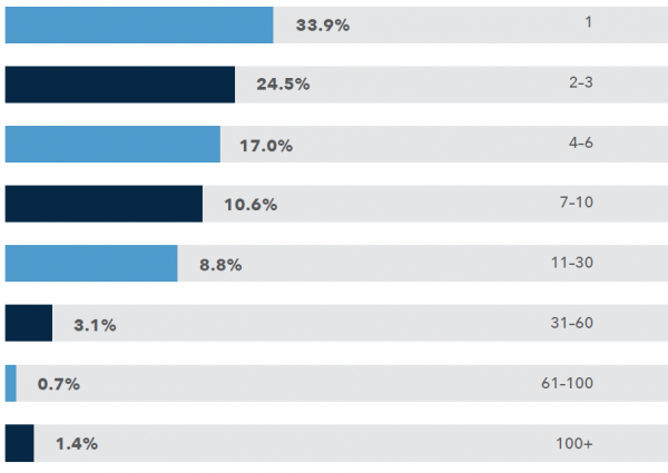 Bezüglich der pro Unternehmen eingesetzten Anzahl der IBM Power Server hat sich keine wesentliche Änderung ergeben. Die beiden führenden Gruppen, 1 Server, respektive 2-5 Server haben beide etwas mehr Anteile als im Vorjahr und decken insgesamt 87% der Teilnehmer ab, was auf die Leistungsfähigkeit der Power Maschinen zurückzuführen ist.