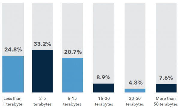 IBM i ist für transaktionsbasierte Daten bei Banken, Händlern und Fertigungsunternehmen im Einsatz, daher arbeiten circa 25% der Unternehmen mit weniger als einem Terabyte Daten auf der IBM i, weil diese strukturierten Daten weit weniger Platzbedarf als Bilder haben.