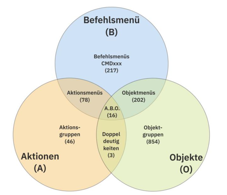Die Doppeldeutigkeiten wollen wir zum Verständnis genauer aufschlüsseln, denn hinter jedem Element im Venn-Diagramm stecken am Ende Befehle aus dem System (ohne hier individuelle Anpassungen von Befehlen zu betrachten):