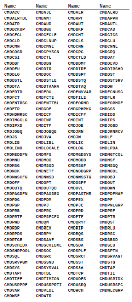 Diese Menüs beginnen üblicherweise mit CMDxxx und sind somit leicht zu identifizieren. Die Existenz eines Menüs zu einer Komponente des Namens eines Befehls (z.B. CMDWRK) gibt einen Hinweis darauf, dass die Komponente im Kontext der IBM i eine vordefinierte Gruppierung darstellt.