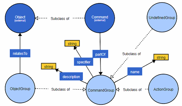 Eine Objektgruppe hat einen direkten Bezug zu Objekten mit der relatesTo Beziehung. Die undefinierte Gruppe (UndefinedGroup) dient als expliziter Platzhalter für die Doppeldeutigkeiten und generell den Befehlen, welche noch nicht zugeordnet wurden. Mit der OWL2 können detaillierte Äquivalenzklassen konstruiert werden, welche aussagen, dass ein Befehl der keiner anderen Gruppe angehört, automatisch Teil der undefinierten Gruppe ist.