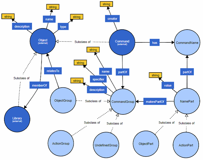 Die drei Klassen verfügen über weitere Eigenschaften zur Benennung (name) und Beschreibung (description). Diese Felder werden von Objekt zu Bibliothek und Befehl vererbt (SubClassOf).