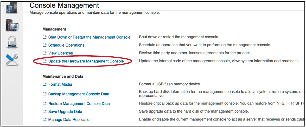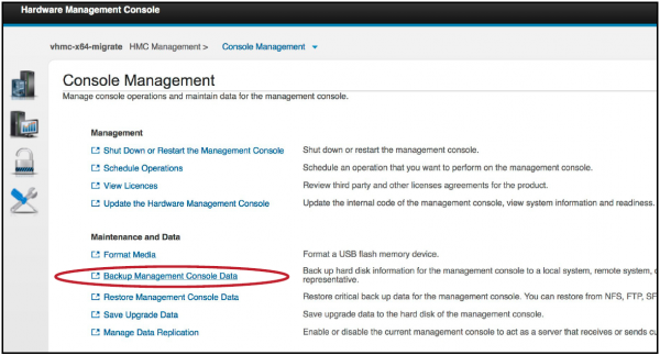 Der Einstieg für einen HMC/vHMC Backup erfolgt in der GUI der HMC/vHMC über „HMC Management“ ›› „Console Management“, siehe Abb. 3.11a, dann weiter auf der rechten Seite über „Backup Management Console Data“, siehe Abb.3.10b.