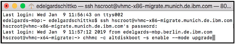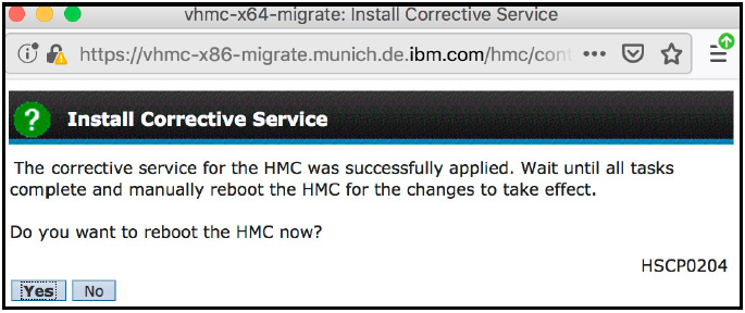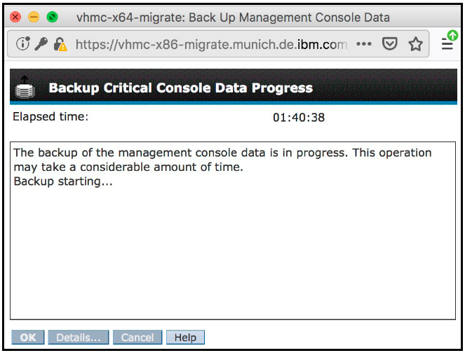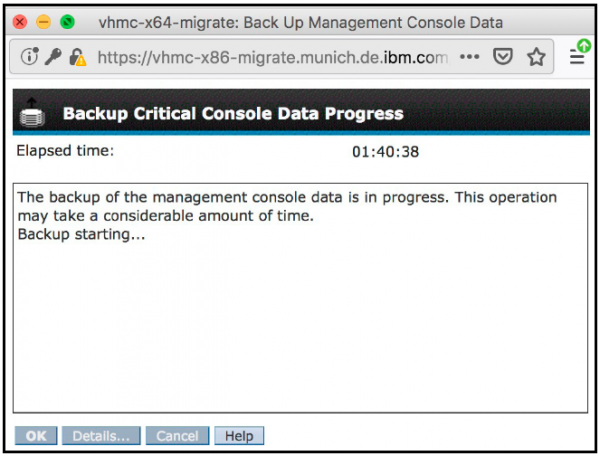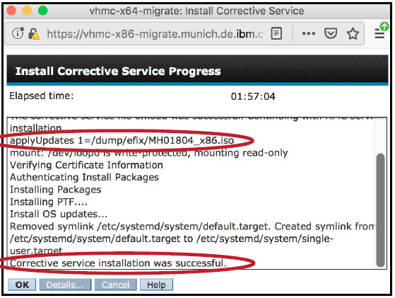 wird als Zeitbedarf 30 – 45 min angegeben für diesen Restart mit Upgrade, im Testscenario dauerte es 35 min, bis eine Anmeldung an der vHMC ( https://vhmc-x86-migrate.munich.de.ibm.com) über den Browser mit dem User hscroot möglich war.