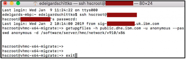 Prinzipiell hängt der konkrete Weg, eine remote virtuelle Terminal-Session zur HMC/vHMC aufzubauen, vom verwendeten Endgerät ab, nachfolgende Screenshots sind erstellt worden von einem MacBook mit der dort verfügbaren Terminal-Funktion und ssh auf die vHMC mit dem User hscroot, siehe Abbildung 3.4c.