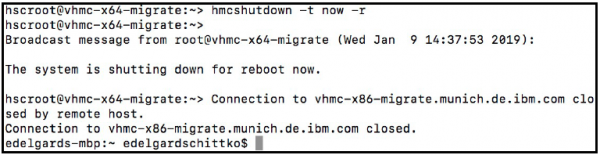 Der eigentliche Upgrade wird beim Restart der HMC/vHMC ausgeführt. Ein Restart kann über die GUI gestartet werden (siehe Abb. 3.3) oder es kann dafür nachfolgender Befehl in der Terminal-Session verwendet werden, siehe auch Abbildung 3.7: