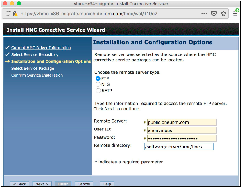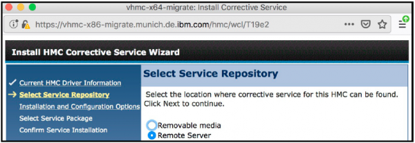 Wie in Schritt 5 wurde auch hier als Installationsquelle ein bestimmter IBM-FTP-Server aus dem Internet verwendet zum direkten Download der Software auf die vHMC der Testumgebung. Weil die vHMC einen Internet-Zugang hat, ist dieser Installationsweg möglich.