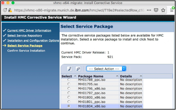 Nachfolgend einige Screenshots (Abb. 3.9a bis 3.9j) von der Installation von vMH01789 und vMH01804, nacheinander mit Restart (Reboot) der vHMC dazwischen auf der vHMC(x86)-Testumgebung gemäß Anleitung