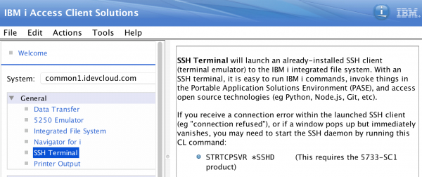 - SSH ist zu einem wichtigen Werkzeug für den Zugriff auf IBM i geworden. Wenn auf Ihrem Gerät bereits ein SSH-Client installiert ist, erkennt ACS diesen. Mit einem einzigen Klick öffnet sich ein SSH-Terminal-Emulator für Ihr System
