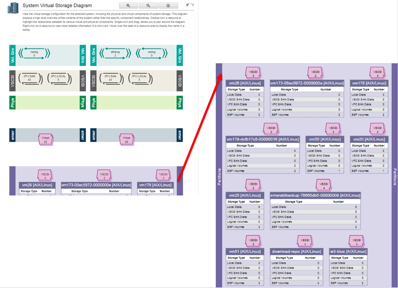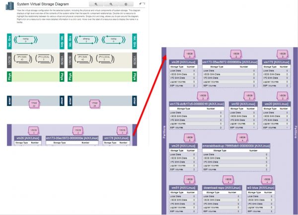 Die Darstellungen der Adapter Ansicht zu virtuellem Speicher wurden erweitert (siehe Abb 4.2-4). Es ist jetzt möglich, aus dieser Ansicht neue Speicher Definitionen hinzuzufügen. Auch im Bereich des virtuellen Fibre Channel wurde die Darstellung noch erweitert.